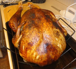 Now, if I were not venturing into new territory and making an additional dressing (one in the bird, the other in a baking pan), I would tell you to double the above recipe and place the remaining bread mixture in a pan and bake it for about 30 minutes at 350 degrees. Word of warning: it is very dry and requires oodles of gravy.